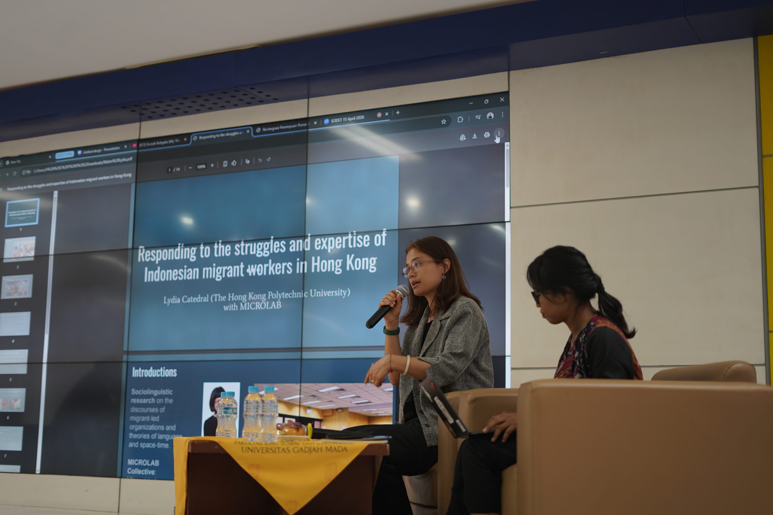 Dalam pemaparannya, Prof. Lydia menyoroti kerentanan struktural yang dihadapi PMI di Hong Kong, seperti jam kerja panjang, kondisi kerja tidak layak, hingga kebijakan yang diskriminatif. Hambatan bahasa dan stigma sosial turut mempersempit akses pekerja migran terhadap perlindungan hak-haknya. Namun demikian, ia menekankan bahwa pekerja migran tidak hanya berada dalam posisi rentan, melainkan juga memiliki kapasitas kolektif yang kuat. Melalui inisiatif seperti MICROLAB, sebuah komunitas migran dan Jaringan Buruh Migran Indonesia (JBMI), para pekerja membangun jaringan peer support yang memproduksi pengetahuan praktis dan kritis guna melakukan advokasi mandiri.